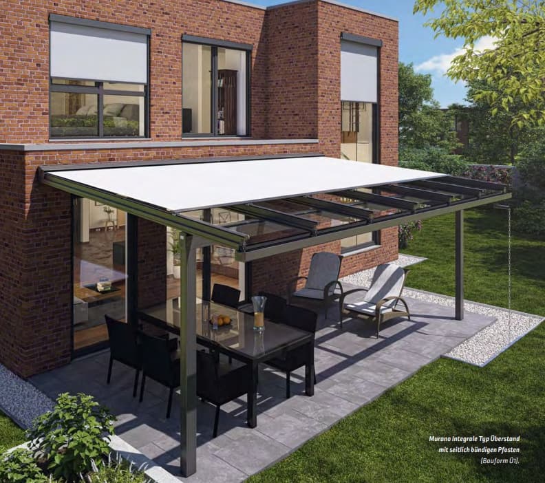 Die Murano Integrale kombiniert ein Glasdach mit integrierter Markise für optimalen Schutz vor Regen, Sonne und Temperaturschwankungen. Die Markise verschwindet elegant im Wandprofil. Optional mit bündigen oder eingerückten Pfosten.